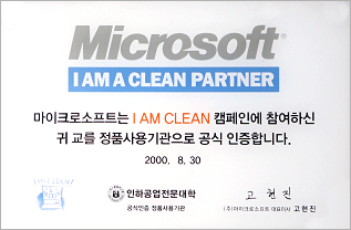 Microsoft i am a clean partner 마이크로소프트는 i am clean 캠페인에 참여하신 귀 교를 정품사용기관으로 공식 인증합니다.2000. 8. 30 인한공업전문대학 공식인증 정품사용기관 (주) 마이크로소프트 대표이사 고현진